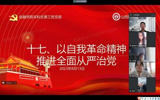 概要:继上次本科生第三党支部预备党员原红丹带领大家学习第十六章的内容后,在8月13日进行了第十七章和第十八章的学习,本讲的主要内容是“以自我革命精神推进全面从严治党”和“坚持不懈用新时代中国特色社会主义思想武装头脑指导实践、推动工作”,本讲由本科生第三党支部预备党员张乐燕带领大家学习,本科生第三党支部邱马玥主持并总结发言。
