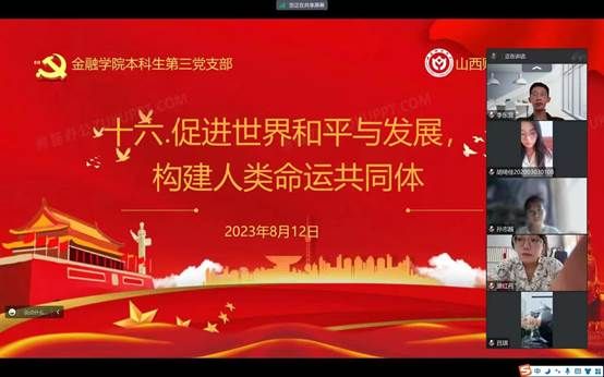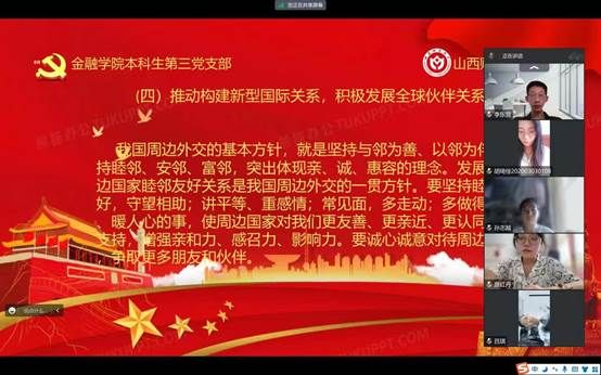 会议最后,本科生第三党支部邱马玥讲到,“将目光放远,我们现在所做的各种努力都是为未来蓄力,构建人类命运共同体不是一挥而就的,我们需要更丰富的知识,更好的对事情的处理方式,更娴熟的待人接物的方式,面向世界,做出下一步抉择,让我们在五彩的跑道上挥洒属于我们的青春的汗水。”