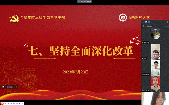 概要:继上次本科生第三党支部预备党员万泓滢带领大家学习《实施科教兴国战略,强化现代化建设人才支撑》后,在7月23日进行了第七章和第八章的学习,本章的主要内容是“坚持全面深化改革”和“推进社会主义民主政治建设,发展社会主义政治”,本章由本科生第三党支部预备党员王静宜带领大家学习,本科生第三党支部邱马玥主持并总结发言。