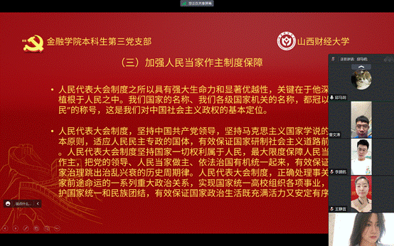 “全面深化改革,推进社会主义民主政治建设,是我们党在实现发展目标中不可或缺的动力源泉。”会议伊始,本科生第三党支部预备党员王静宜讲到。随后,她以《坚持全面深化改革,推进民主政治建设》为主题,给支部成员们分享了她的学习心得——“全面深化改革是前进的动力,民主政治建设是进步的保障。在抗击新冠肺炎疫情中,众志成城的力量,展现了改革开放的韧性和应对危机的能力。历史告诉我们,只有坚持人民主体地位,推进社会主义民主政治建设,才能让亿万人民的智慧和力量得到充分释放,为国家建设和发展注入源源不断的动力。”