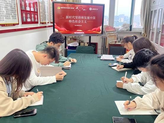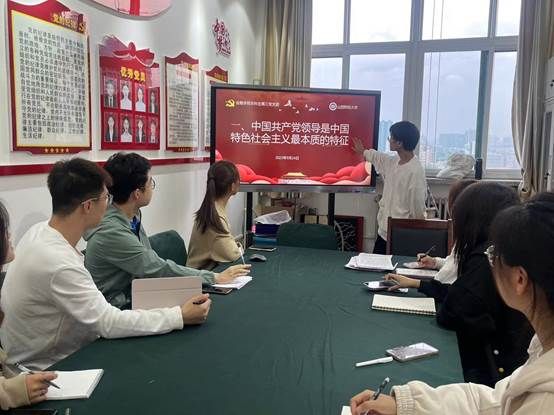 “没有中国共产党就没有新中国,就没有中国特色社会主义,就没有中华民族伟大复兴。历史和人民选择了中国共产党,中国共产党也没有辜负历史和人民的选择。中国共产党无愧为伟大光荣正确的觉,无愧为中国工人阶级的先锋队,无愧为中国人民和中华民族的先锋队。”本科生第三党支部预备党员洪昊讲到。随后,他给支部成员们分享了主题为《中国共产党领导是中国特色社会主义最本质的特征,新时代坚持和发展中国特色社会主义》的学习心得——“在当今中国,中国共产党是最高的政治领导力量。习近平总书记强调:党的领导是全面的、系统的、整体的,必须全面、系统、整体加以落实。国家治理体系是由众多子系统构成的复杂系统,这个系统的核心是中国共产党,人大、政府政协、监委、法院、检察院、军队,各民主党派和无党派人士,各企事业单位,工会、共青团、妇联等群团组织,都要坚持中国共产党领导。”