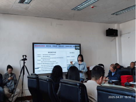 高侯平老师代表风险管理课程团队,就《风险管理》双语课程集体备课总体情况、课程教学目标、学情分析、课程设计创新点、课程思政融入情况、课程评价考核情况等进行汇报。根据上周集体备课指导动员过程中李静萍院长提出的课程建设“理论化、兴趣化、通俗化”的“三化结合”要求、芦锋副院长提出的“人工智能赋能教育教学创新”要求,高侯平老师重点汇报了如何在具体学情分析的基础上结合“三化结合”要求进行课程内容设计、如何运用Deepseek设计场景化风险管理案例进行课程教学创新。