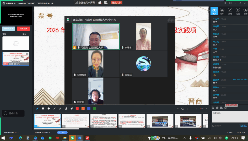“探寻晋商足迹,赓续晋商精神”“小学期”课程组通过学习通直播课堂和腾讯会议相结合的方式,集中为近400位同学开展了一次培训。毛成刚老师介绍了本次活动的概况、实践活动的目的和意义、实践要求、成果提交要求等工作;张亚兰老师对学生调研内容提出了具体的建议;张宏彦老师在实践活动和调研工作方面提出了针对性要求;梁娜老师专门培训了田野调查的方法和技巧;李松珊老师对调研资料数据整理方法进行了讲解。通过培训,引导学生通过调研活动了解晋商在各地的遗址遗迹和发展情况,掌握一手资料,深入调研晋商(包括票号)历史遗存,挖掘晋商文化内涵,体悟晋商精神精髓,研究晋商对当地经济社会发展产生的影响,掌握地方经济社会发展脉络,使学生在专业实践中得到锻炼,厚植中华民族博大精深的商业文明,见微知著,培育勇于传承民族优秀文化和敢于担当时代重任的大学生,着力构建“家国本色、晋商特质、开放创新”的新商科育人体系。培训期间,同学们全程认真学习。培训课后,部分同学还通过学习通与好的指导教师进行了进一步的具体沟通、咨询。