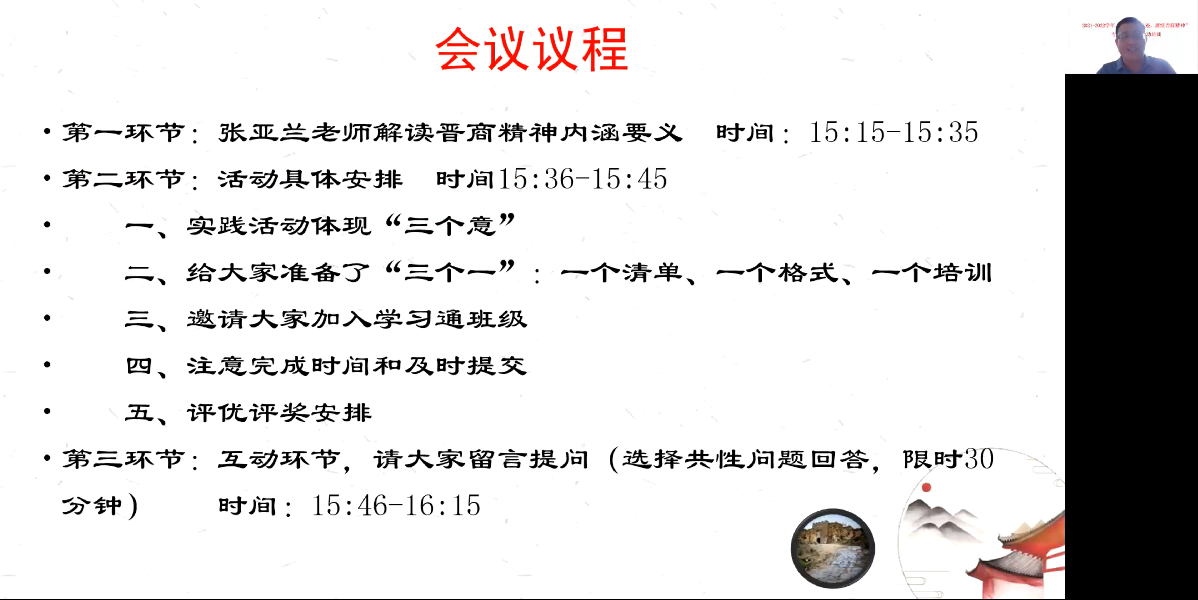 通过此次专题培训,学生们对学校开展此次“探寻晋商足迹,赓续晋商精神”专题社会实践有了更深入的了解,对探寻晋商精神有了更浓厚的兴趣,对专业理论知识与社会实践活动相结合有了更清晰的认识,对完成好此次社会实践调研报告有了更加的笃定,相信此次专题社会实践线上培训活动一定会促进学生们更好的了解晋商精神,使学生们在专业实践中得到锻炼,做勇于传承民族优秀文化和敢于担当时代重任的大学生。