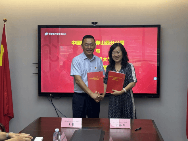 院长李静萍受田祥宇校长授权代表学校与中国银河证券山西分公司党总支书记、分公司总经理共同签约。