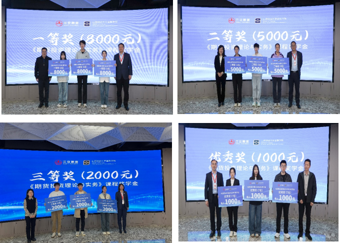 副院长芦锋与三立期货财务总监田军卫为获得优秀奖学金的同学颁奖。获奖学生代表通过VR短视频和现场感谢的形式同“期货与财富管理”微专业学生代表,表达了对校企合作的感谢与期待。