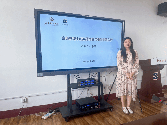 金融科技教研室李旸副教授做了题为“金融领域中的实体情感与事件关系分析”的学术报告。人工智能作为当今前沿科技领域,其与金融的融合正受到前所未有的关注。报告中,李旸老师首先介绍了人工智能领域的发展,随后针对金融领域文本数据的特点,分享了她在“金融领域中的实体情感分析方法”和“金融事件因果关系抽取方法”方面的最新研究成果,强调了实体抽取与情感判别、事件因果关系研究在金融领域应用的重要性。