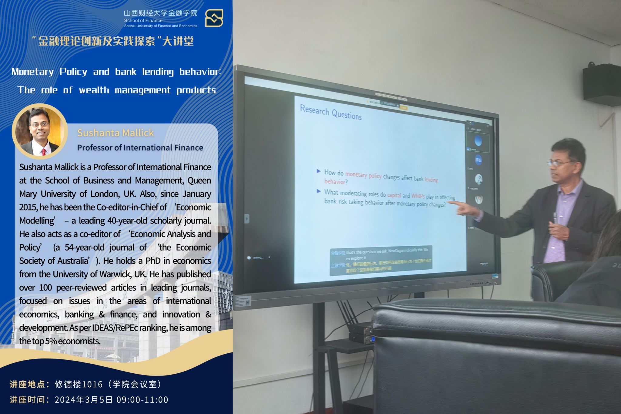 金融理论创新及实践探索”大讲堂第25期: Sushanta Kumar Mallick教授学术讲座“Monetary policy and bank lending behavior: the role of wealth management products”